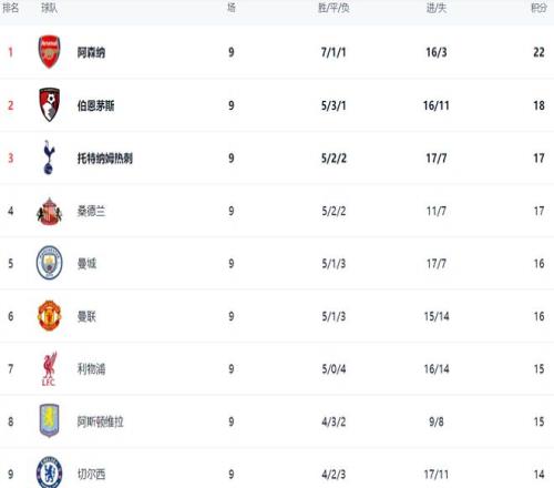 在积分榜上,阿森纳以22分高居榜首。伯恩茅斯紧随其后,拿到18个积分。身价只有4.4亿欧元的伯恩茅斯能够来到这个位置,非常不容易。热刺以17分排名第3。桑德兰也是17分,排名第4。没想到伯恩茅斯和桑德兰这两匹黑马都杀入欧冠区。曼城16分排名第5。曼联也是16分,排名第6。利物浦15分排名第7。