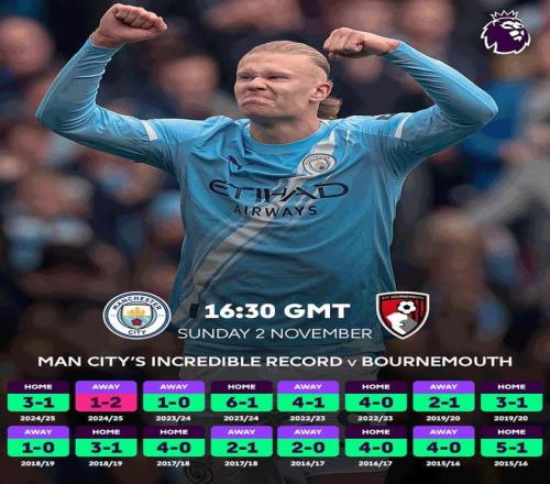 如果考虑各项赛事,曼城对伯恩茅斯的历史总战绩则为21胜2平1负,打进63球丢16球。