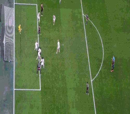 第7分钟,差一点,加比亚头球攻门击中门框